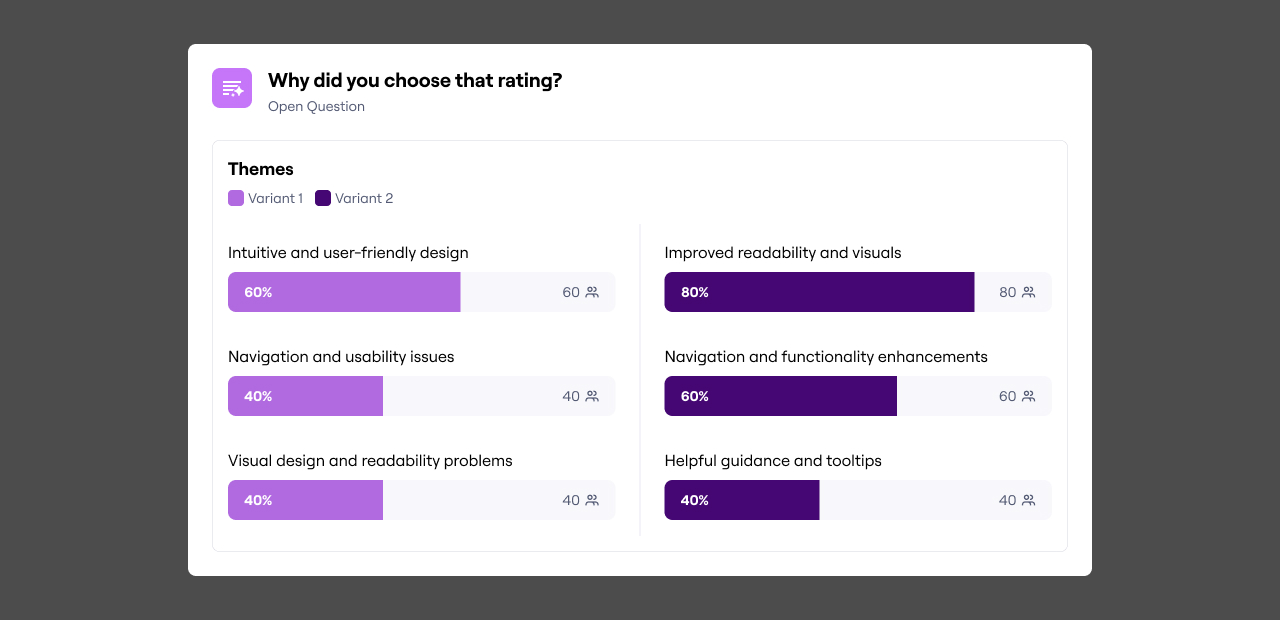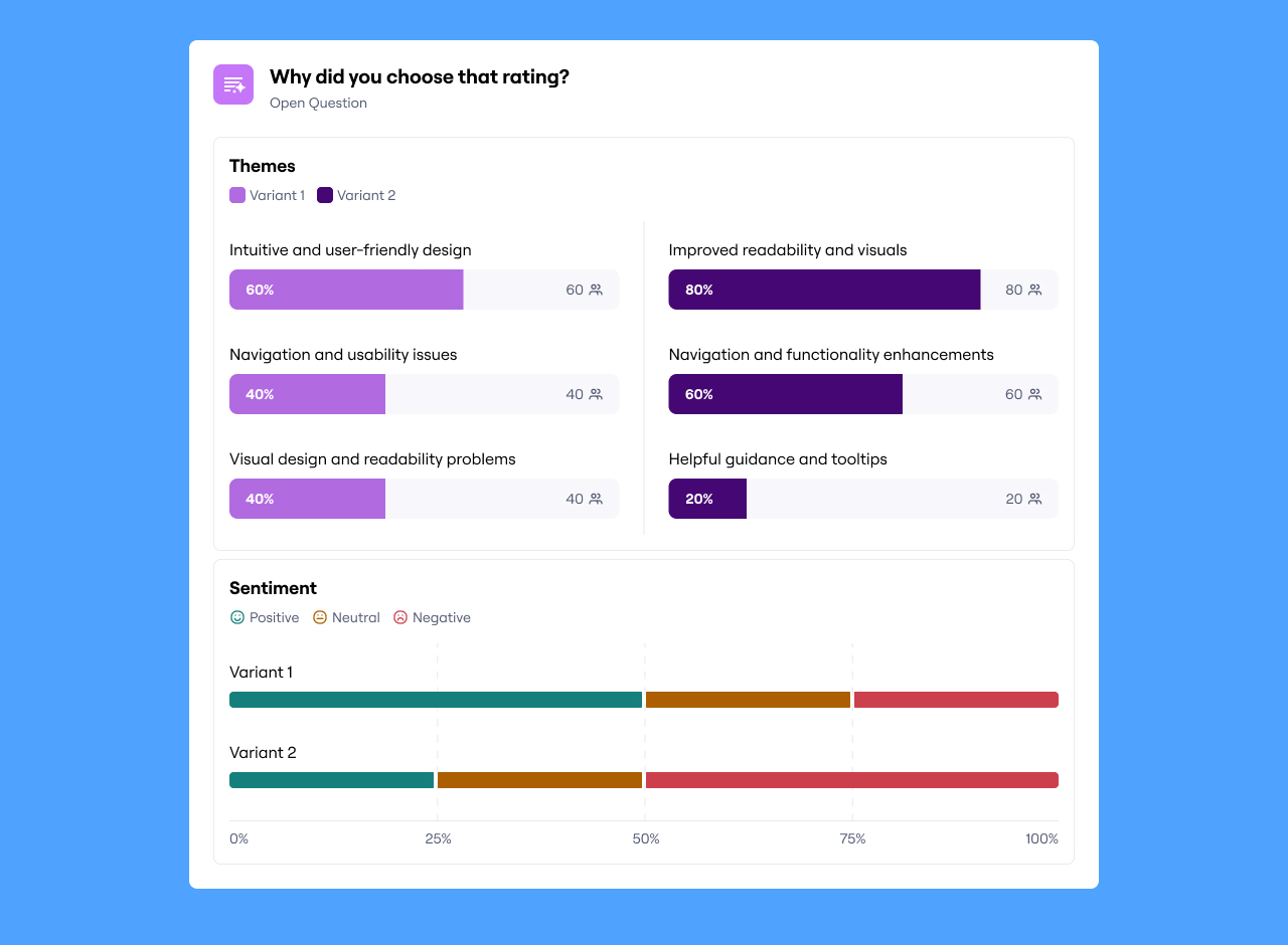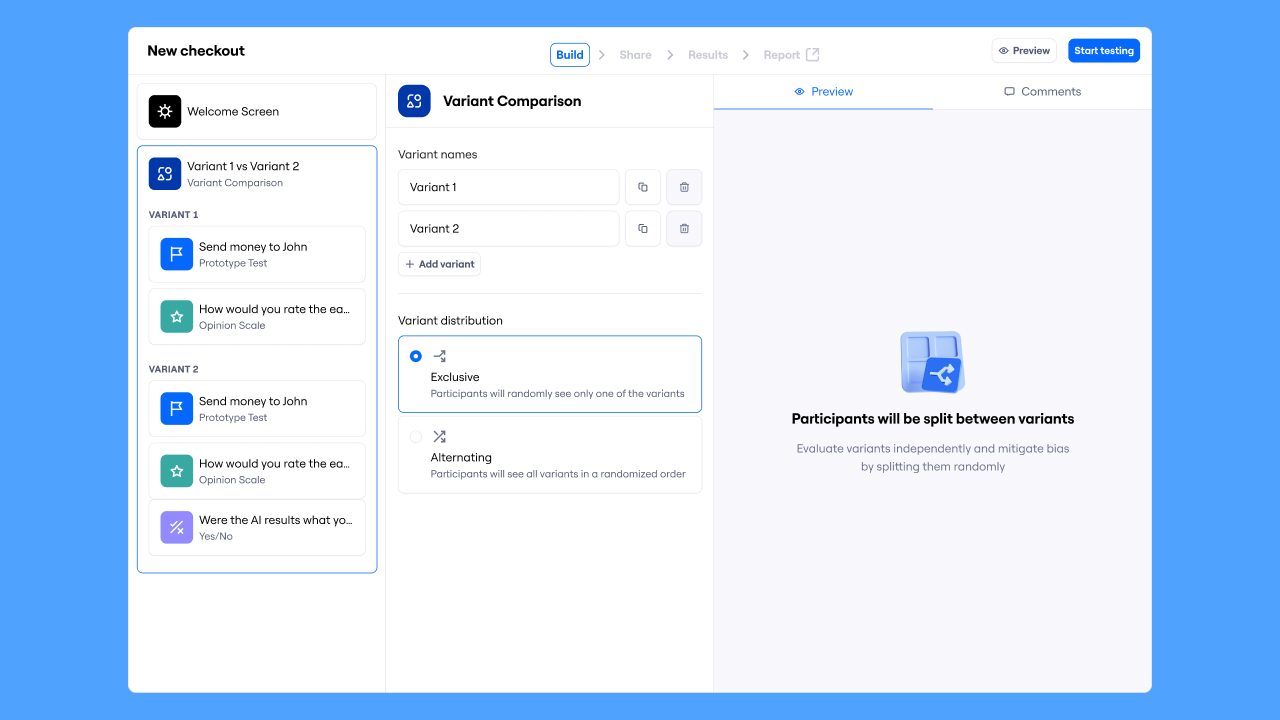 The new Variant Comparison block, a flexible end-to-end system for unmoderated research comparisons with setup flexibility and at-a-glance results comparisons, with a brand new data visualization system.